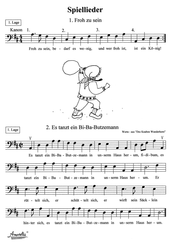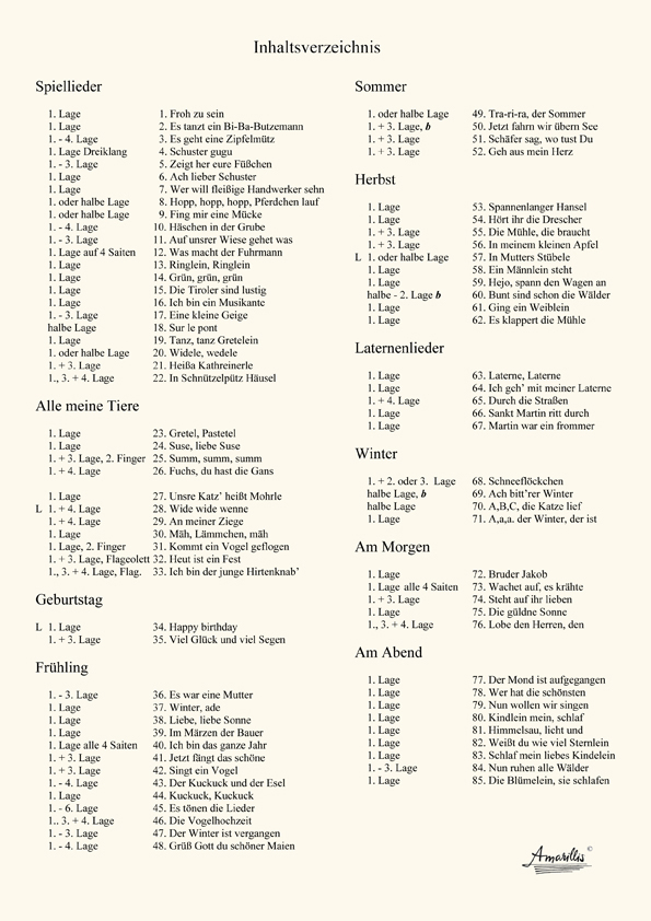 Unsere Liederbücher wollen keine Instrumentalschule sein oder ersetzen, sondern sind eine Ergänzung des Unterrichtsmaterials. Gerade junge Spieler brauchen oft mehr Spielmaterial auf einer Entwicklungsstufe. Die 85 Lieder sind nach Themen geordnet, damit die Kinder die Musik im Jahreszeitenrhythmus erleben können. Für Vorspiele und kleine Familienfeiern kommt das sehr gelegen. Die Tonarten sind bewusst für junge Streicher gewählt. Deshalb liegt der Schwerpunkt auf G- und D-Dur. Natürlich gibt es Ausnahmen: „A, B, C, die Katze lief in Schnee“ muss auch mit diesen Tonnamen beginnen! Wir haben bewusst Lieder mit interessanten Rhythmen und Taktarten mit aufgenommen. Bei Lied Nr. 74, 51, 42 können die Kinder für die Veränderungen des Pulses sensibel werden. Dazu wird man das Lied erst sprechen und singen. Alle Lieder sind mit Texten abgedruckt, da die Kinder die Lieder schön singen können sollten. Das hilft sehr für eine gute Intonation und die musikalische Gliederung. Die Stricharten reichen von kleinen Strichen in der Mitte (Nr.61,14), zu symmetrischem Pendeln (Nr.5,18) und angehängten Strichen. Ruhiges Ziehen ist bei den Abendliedern gefragt.