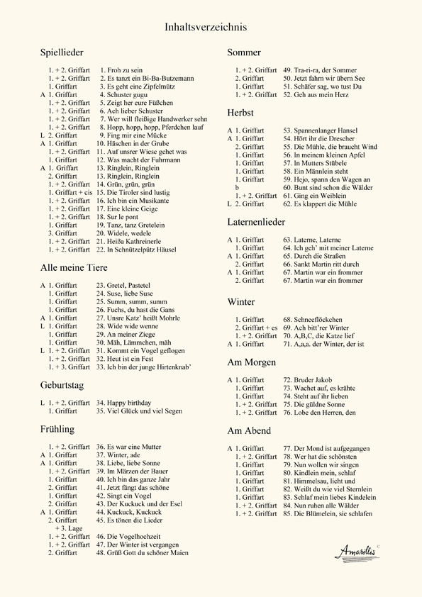 Unsere Liederbücher wollen keine Instrumentalschule sein oder ersetzen, sondern sind eine Ergänzung des Unterrichtsmaterials. Gerade junge Spieler brauchen oft mehr Spielmaterial auf einer Entwicklungsstufe. Die 85 Lieder sind nach Themen geordnet, damit die Kinder die Musik im Jahreszeitenrhythmus erleben können. Für Vorspiele und kleine Familienfeiern kommt das sehr gelegen. Die Tonarten sind bewusst für junge Streicher gewählt. Deshalb liegt der Schwerpunkt auf G- und D-Dur. Natürlich gibt es Ausnahmen: „A, B, C, die Katze lief in Schnee“ muss auch mit diesen Tonnamen beginnen! Wir haben bewusst Lieder mit interessanten Rhythmen und Taktarten mit aufgenommen. Bei Lied Nr. 74, 51, 42 können die Kinder für die Veränderungen des Pulses sensibel werden. Dazu wird man das Lied erst sprechen und singen. Alle Lieder sind mit Texten abgedruckt, da die Kinder die Lieder schön singen können sollten. Das hilft sehr für eine gute Intonation und die musikalische Gliederung. Die Stricharten reichen von kleinen Strichen in der Mitte (Nr.61,14), zu symmetrischem Pendeln (Nr.5,18) und angehängten Strichen. Ruhiges Ziehen ist bei den Abendliedern gefragt.