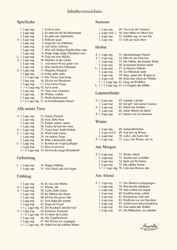 Unsere Liederbücher wollen keine Instrumentalschule sein oder ersetzen, sondern sind eine Ergänzung des Unterrichtsmaterials. Gerade junge Spieler brauchen oft mehr Spielmaterial auf einer Entwicklungsstufe. Die 85 Lieder sind nach Themen geordnet, damit die Kinder die Musik im Jahreszeitenrhythmus erleben können. Für Vorspiele und kleine Familienfeiern kommt das sehr gelegen. Die Tonarten sind bewusst für junge Streicher gewählt. Deshalb liegt der Schwerpunkt auf G- und D-Dur. Natürlich gibt es Ausnahmen: „A, B, C, die Katze lief in Schnee“ muss auch mit diesen Tonnamen beginnen! Wir haben bewusst Lieder mit interessanten Rhythmen und Taktarten mit aufgenommen. Bei Lied Nr. 74, 51, 42 können die Kinder für die Veränderungen des Pulses sensibel werden. Dazu wird man das Lied erst sprechen und singen. Alle Lieder sind mit Texten abgedruckt, da die Kinder die Lieder schön singen können sollten. Das hilft sehr für eine gute Intonation und die musikalische Gliederung. Die Stricharten reichen von kleinen Strichen in der Mitte (Nr.61,14), zu symmetrischem Pendeln (Nr.5,18) und angehängten Strichen. Ruhiges Ziehen ist bei den Abendliedern gefragt.