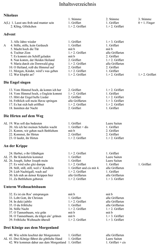 Dieses Weihnachtsliederbuch für Geige ist nicht nach Schwierigkeit, sondern nach Themen geordnet. Über Advent, Herbergssuche und die Hirten auf den Feldern führt dieser Weg zur Krippe, zu der am Ende auch noch die drei Könige finden. Für Weihnachtsvorspiele von Instrumentalklassen lassen sich mit einer kleinen Auswahl aus diesen Liedern schöne „Krippenspiele“ zusammenstellen, die sich durch kurze Verse und Instrumentalstücke ergänzen lassen. Jüngere Zuhörer vollziehen den Fortgang der Geschichte gerne mit, indem sie vor jedem Lied die passenden Krippenfiguren weiterbewegen dürfen. Die Tonarten sind bewusst für junge Streicher gewählt. Deshalb liegt der Schwerpunkt auf G- und D-Dur. Trotzdem wollten wir nicht auf die „weihnachtliche“ Tonart F-Dur verzichten. Alle Lieder sind zwei- oder dreistimmig gesetzt. Dabei ist die 2. Stimme oft schwieriger als die Melodiestimme.