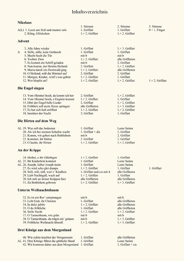 Dieses Weihnachtsliederbuch für Bratsche ist nicht nach Schwierigkeit, sondern nach Themen geordnet. Über Advent, Herbergssuche und die Hirten auf den Feldern führt dieser Weg zur Krippe, zu der am Ende auch noch die drei Könige finden. Für Weihnachtsvorspiele von Instrumentalklassen lassen sich mit einer kleinen Auswahl aus diesen Liedern schöne „Krippenspiele“ zusammenstellen, die sich durch kurze Verse und Instrumentalstücke ergänzen lassen. Jüngere Zuhörer vollziehen den Fortgang der Geschichte gerne mit, indem sie vor jedem Lied die passenden Krippenfiguren weiterbewegen dürfen. Die Tonarten sind bewusst für junge Streicher gewählt. Deshalb liegt der Schwerpunkt auf G- und D-Dur. Trotzdem wollten wir nicht auf die „weihnachtliche“ Tonart F-Dur verzichten. Alle Lieder sind zwei- oder dreistimmig gesetzt. Dabei ist die 2. Stimme oft schwieriger als die Melodiestimme.
