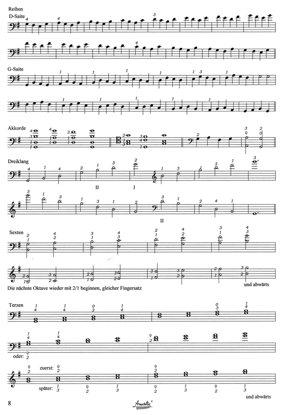Nach Heft 1, wo Tonleitern und Doppelgriffe in der 1. - 4. Lage geübt werden, geht es jetzt im Heft 2 in allen Tonarten über das ganze Griffbrett.